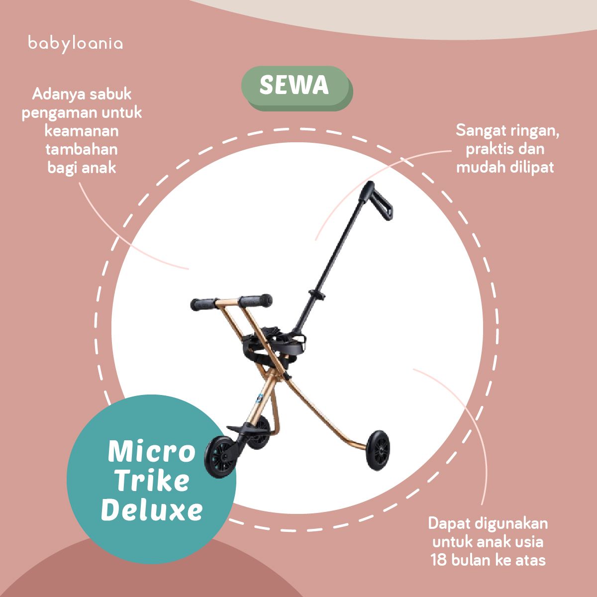 Kini Anda dapat menyewa Micro Trike Deluxe di Babyloania! Sepeda roda tiga ini memiliki desain yang modern. Kami menyukainya karena sepeda ini sangat ringan dan praktis. Bepergian dengan si kecil pun akan lebih mudah dengan Micro Trike Deluxe karena dapat dilipat sehingga dapat disimpan di bagasi mobil yang kecil sekalipun. Perbedaan dengan Micro Trike biasa adalah adanya sabuk pengaman untuk keamanan tambahan bagi anak.