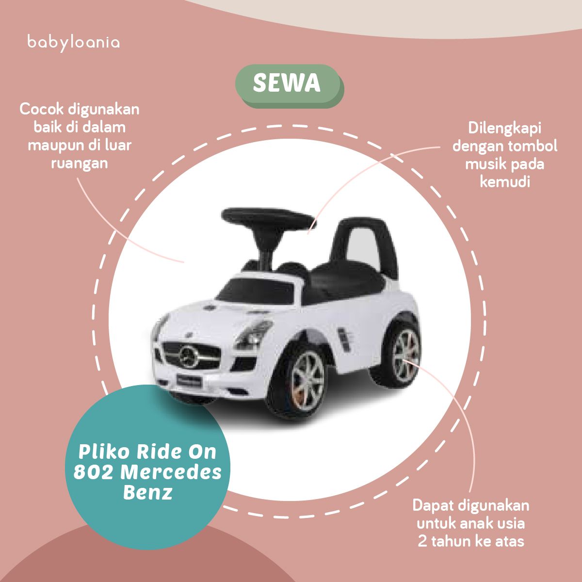 Pliko Ride On Car Mercedes Benz merupakan mainan mobil-mobilan yang cocok digunakan baik di dalam maupun di luar ruangan. Kami menyukainya karena memiliki roda yang dapat digunakan untuk segala permukaan. Bahannya terbuat dari material plastik yang kuat serta tahan lama. Dilengkapi dengan tombol musik pada kemudi dan terdapat bagasi dibawah kursi untuk menyimpan mainan/perlengkapan sikecil. Dapat digunakan untuk anak usia 2 tahun ke atas. Sewa Pliko Ride On Car Mercedes Benz di Babyloania!