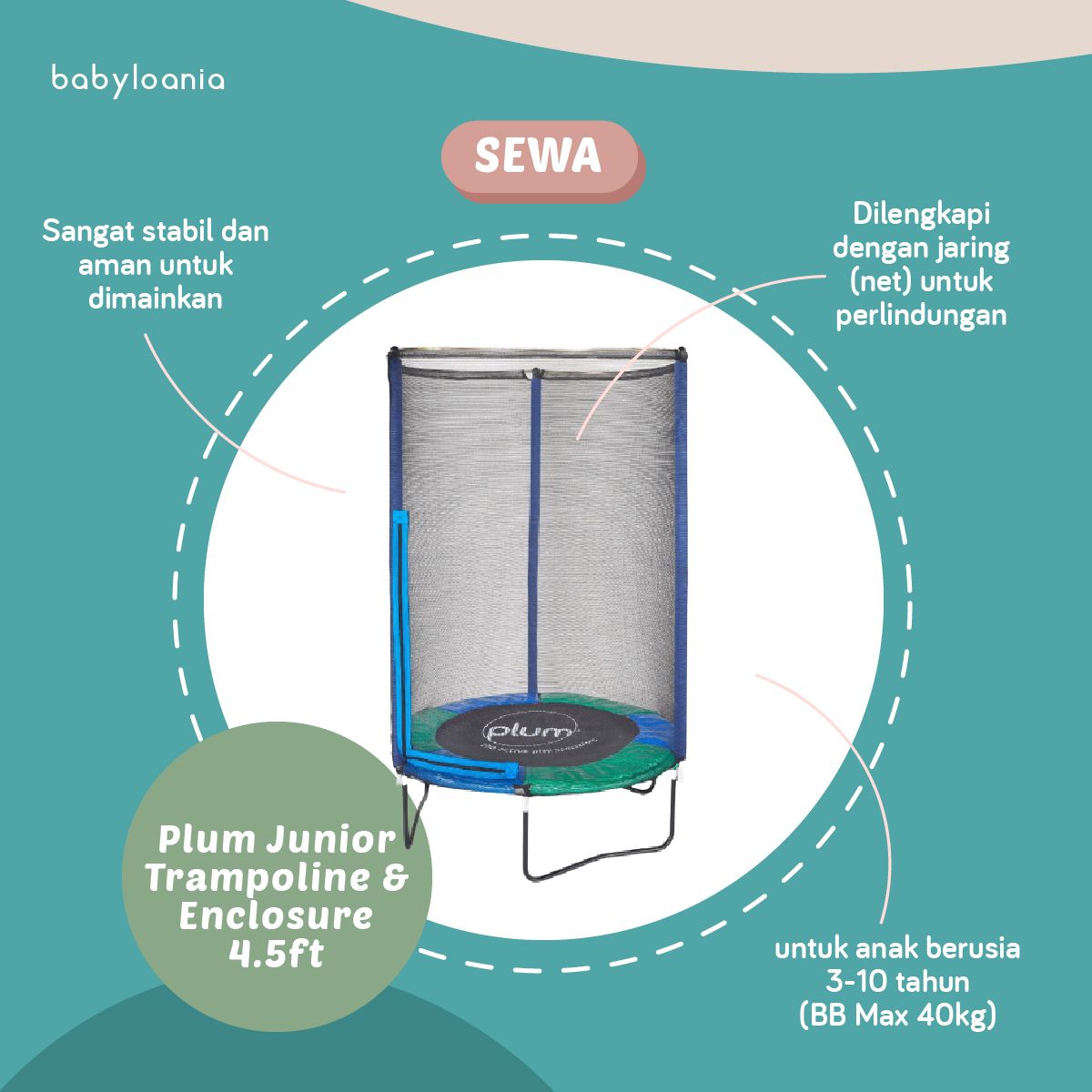 Plum Junior Jumper memiliki konstruksi sesuai dengan standar keamanan untuk dimainkan, dengan struktur rangka besi galvanis untuk perlindungan dari karat. Jaring yang terdapat pada sisi trampolin berfungsi untuk menjaga tubuh si kecil agar tidak terpental. Sangat stabil dan aman untuk dimainkan dengan tinggi frame berkisar 36 cm dari permukaan tanah, dan memudahkan si kecil untuk masuk dan bermain. Percayakan semua kebutuhan permainan si kecil dengan produk berkualitas.