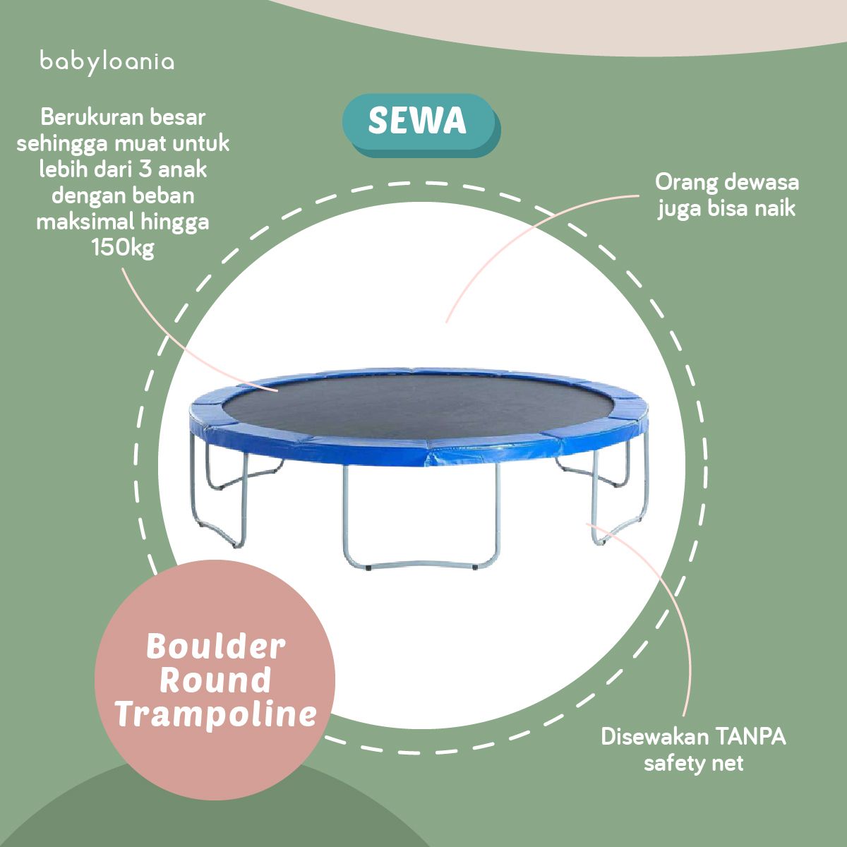 Anda dapat menyewa Boulder Round Trampoline di Babyloania. Trampoline ini berukuran besar sehingga muat untuk lebih dari 3 anak dengan beban maksimal hingga 150kg. Ssst, orang dewasa juga bisa naik lho! NOTE: Trampoline diantarkan dalam keadaan terpisah dan memerlukan perakitan sendiri. Sewa Boulder Round Trampoline (tanpa Safety Net) di Babyloania!